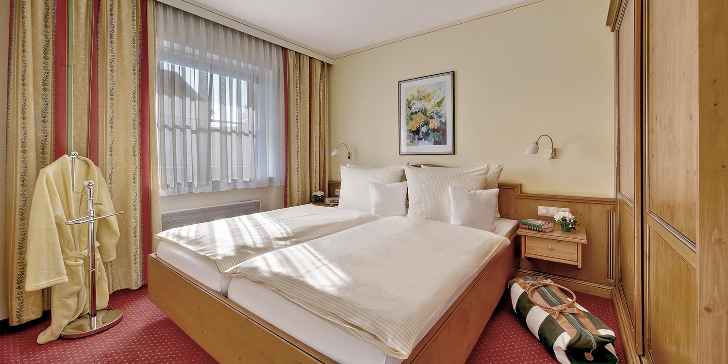 Separated bed- and livingroom, bedroom with 2 single beds (0,9 x 2,00 metres), livingroom with couch, armchair, desk, minibar, couch table, flatscreen-TV 80 cm, telephone, mini-stereo, bathroom with bathtub, second floor – accessible only via stairs (no lift)